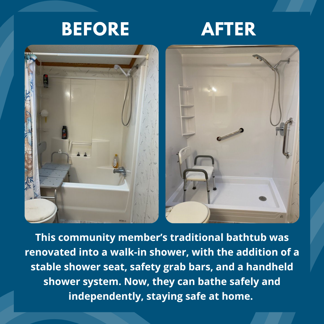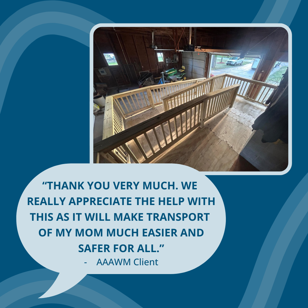 Grant funds also expanded our Caregiver Supplemental Program, which is a program that provides practical goods and services that support safety and independence at home and complement the care provided by caregivers in response to unmet needs. This year, 22 caregivers across Allegan, Ionia, Kent, Montcalm, and Newaygo counties received assistance. Projects included ramps, home repairs, bathroom modifications, and other essential supports. These projects complement AAAWM’s collaborations with trusted local partners in home repair, accessibility, and safety—helping caregivers maintain safe and stable environments for the loved ones they support. See the images below to view this work in action across our community!